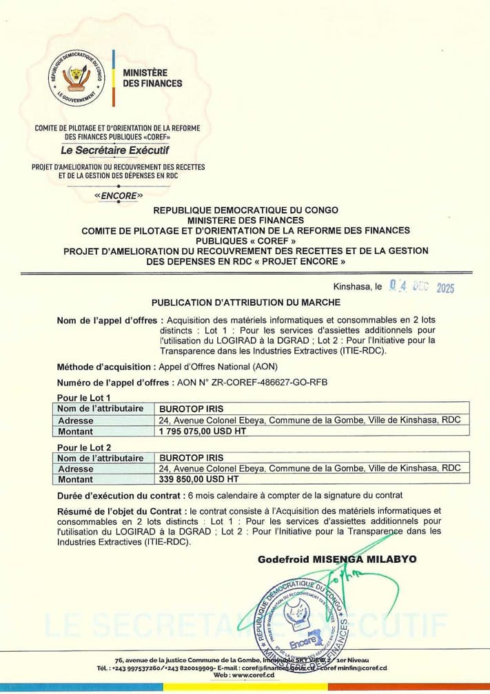 Acquisition des matériels informatiques et consommables en 2 lots distincts : Lot 1 : Pour les services d’assiettes additionnels pour l’utilisation du LOGIRAD à la DGRAD et Lot 2 : Pour l’ITIE-RDC